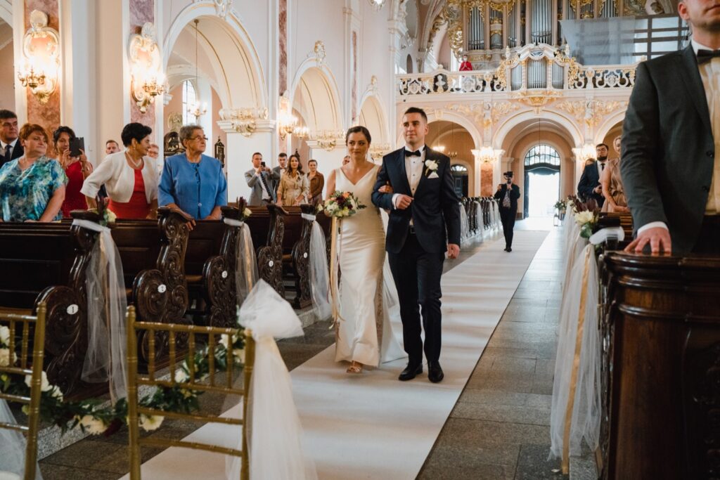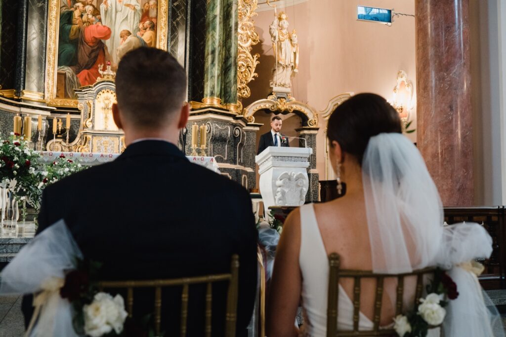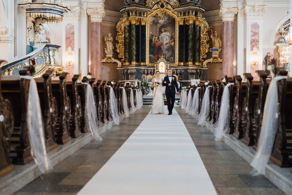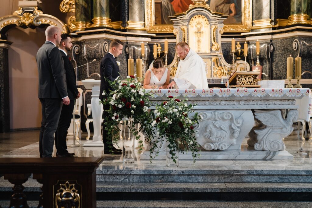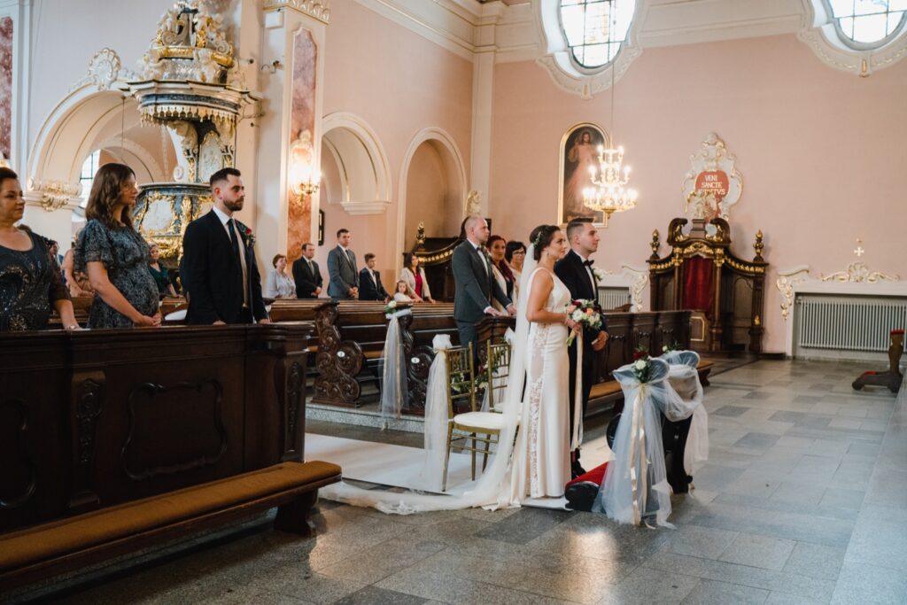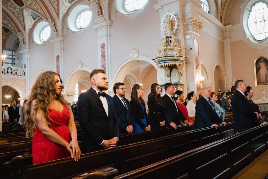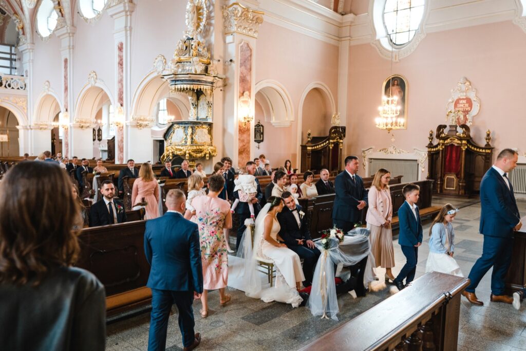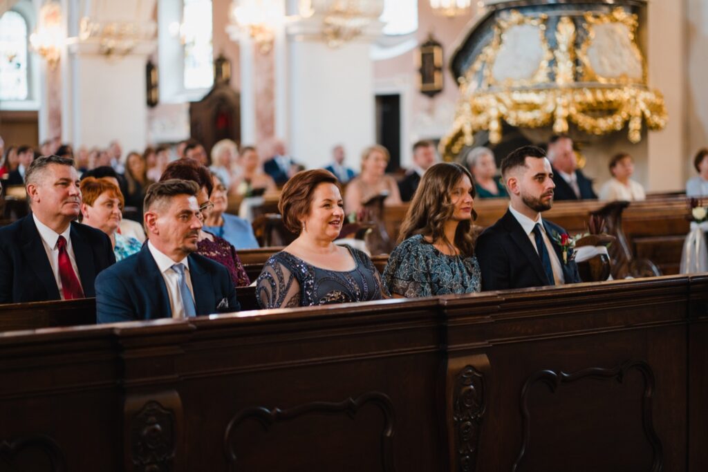Angelika i Bartek, pełni radości i optymizmu rozpoczęli swoje przygotowania. Uśmiech i aura ekscytacji wyczuwalne były w powietrzu. Jeszcze tylko ostatnie dodatki, subtelna biżuteria, zapięty mankiet oraz czuły uścisk – by móc śmiało wkroczyć w ten nowy etap życia. Błogosławieństwo rodziców dodaje otuchy, symbolizuje wsparcie i pojednanie. Swoista magia towarzyszyła zebranym gościom siedzącym w ławkach i oczekujących Państwa Młodych. Czas staje w miejscu, gdy wszystkie oczy zwrócone są na nich. Ceremonia ślubna jest jednym z kluczowych momentów tego dnia, a wypowiedziane słowa przysięgi symbolizują miłość, wierność i oddanie dwojga ludzi. Fotografując ceremonię zaślubin mam możliwość towarzyszyć Wam również emocjonalnie w tym dniu. Rozbrzmiewające pieśni chóralne, dźwięk kościelnych organów budują niezapomniany klimat. Oranżeria kościoła dodała szyku całej ceremonii oraz podkreśliła wyjątkowość tej chwili. Wraz z pierwszymi oklaskami i wiwatem gości rośnie euforia i ekscytacja całego dni. Pierwsze życzenia i czułe uściski napełniają Parę Młodą szczęściem i nadzieją. Jest to idealny moment na zebranie wszystkich gości i zrobienie zdjęcia grupowego.