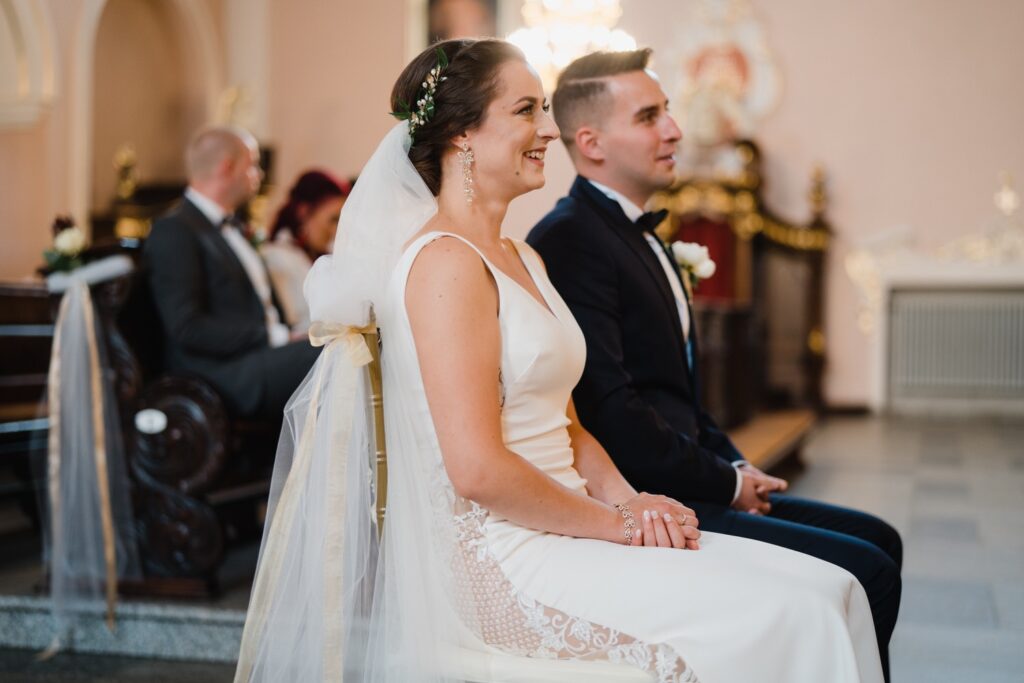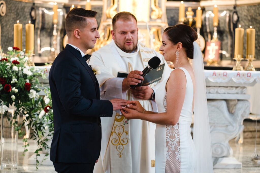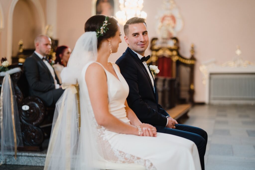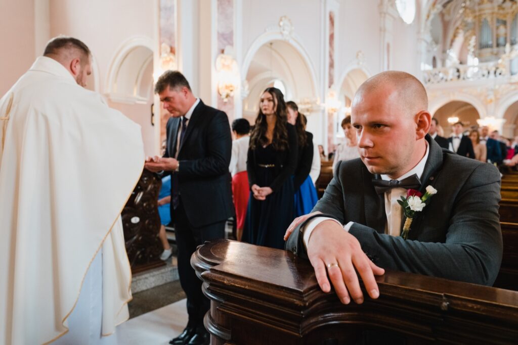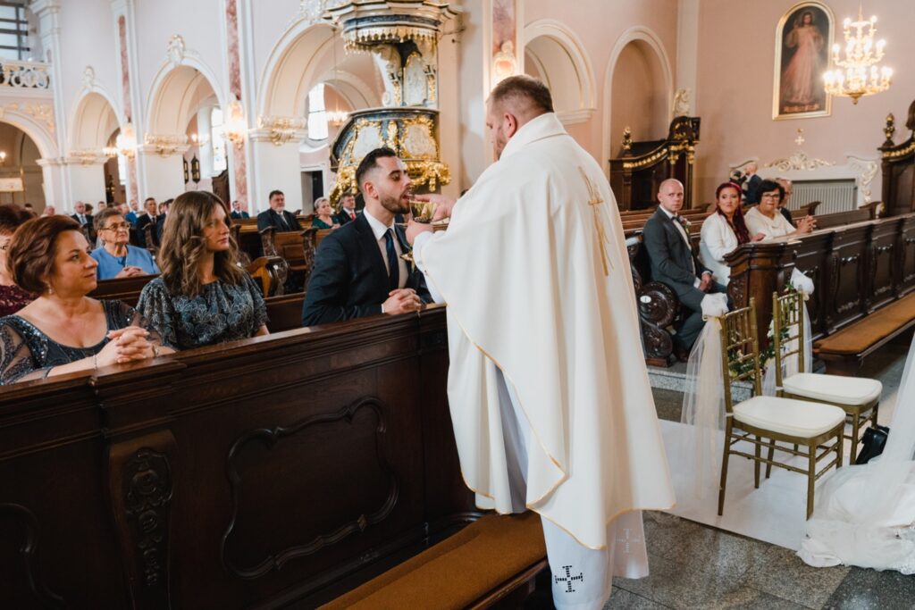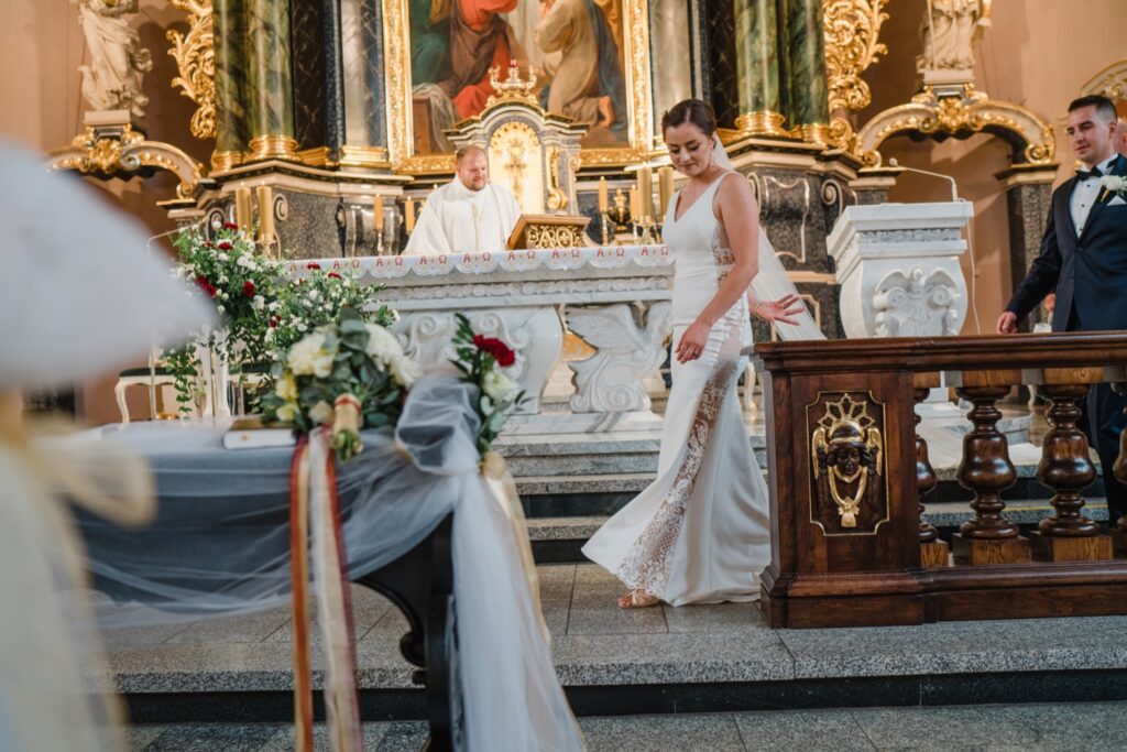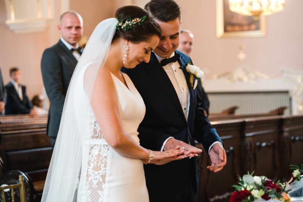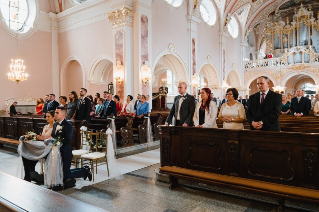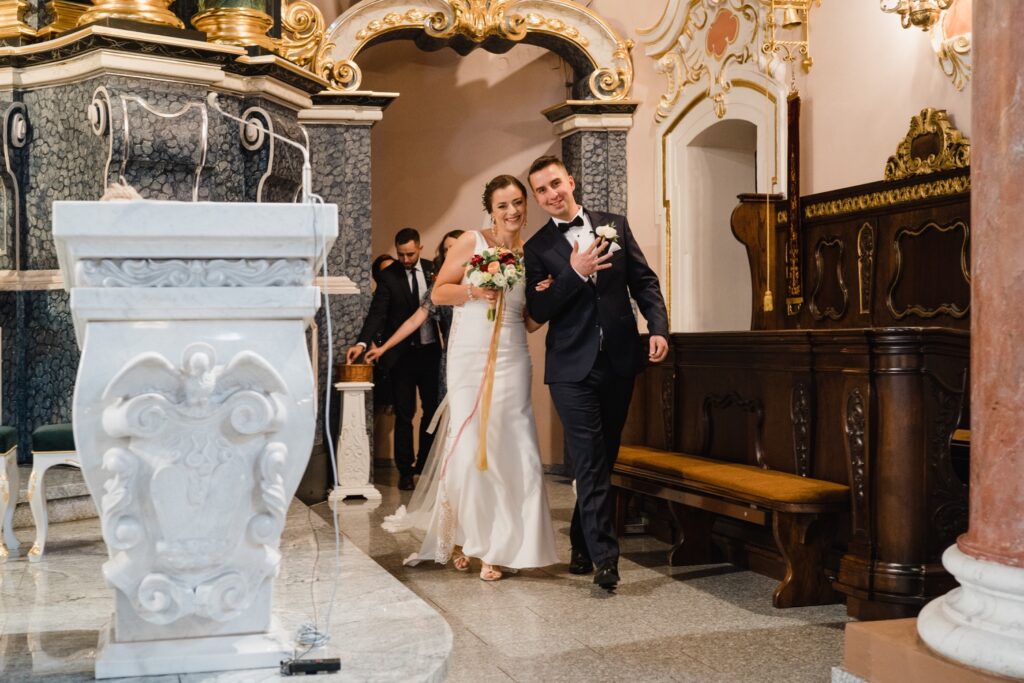 Angelika i Bartek, pełni radości i optymizmu rozpoczęli swoje przygotowania. Uśmiech i aura ekscytacji wyczuwalne były w powietrzu. Jeszcze tylko ostatnie dodatki, subtelna biżuteria, zapięty mankiet oraz czuły uścisk – by móc śmiało wkroczyć w ten nowy etap życia. Błogosławieństwo rodziców dodaje otuchy, symbolizuje wsparcie i pojednanie. Swoista magia towarzyszyła zebranym gościom siedzącym w ławkach i oczekujących Państwa Młodych. Czas staje w miejscu, gdy wszystkie oczy zwrócone są na nich. Ceremonia ślubna jest jednym z kluczowych momentów tego dnia, a wypowiedziane słowa przysięgi symbolizują miłość, wierność i oddanie dwojga ludzi. Fotografując ceremonię zaślubin mam możliwość towarzyszyć Wam również emocjonalnie w tym dniu. Rozbrzmiewające pieśni chóralne, dźwięk kościelnych organów budują niezapomniany klimat. Oranżeria kościoła dodała szyku całej ceremonii oraz podkreśliła wyjątkowość tej chwili. Wraz z pierwszymi oklaskami i wiwatem gości rośnie euforia i ekscytacja całego dni. Pierwsze życzenia i czułe uściski napełniają Parę Młodą szczęściem i nadzieją. Jest to idealny moment na zebranie wszystkich gości i zrobienie zdjęcia grupowego.