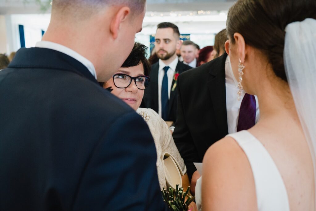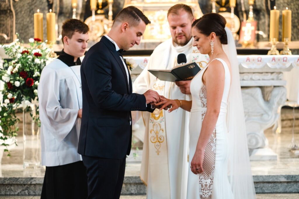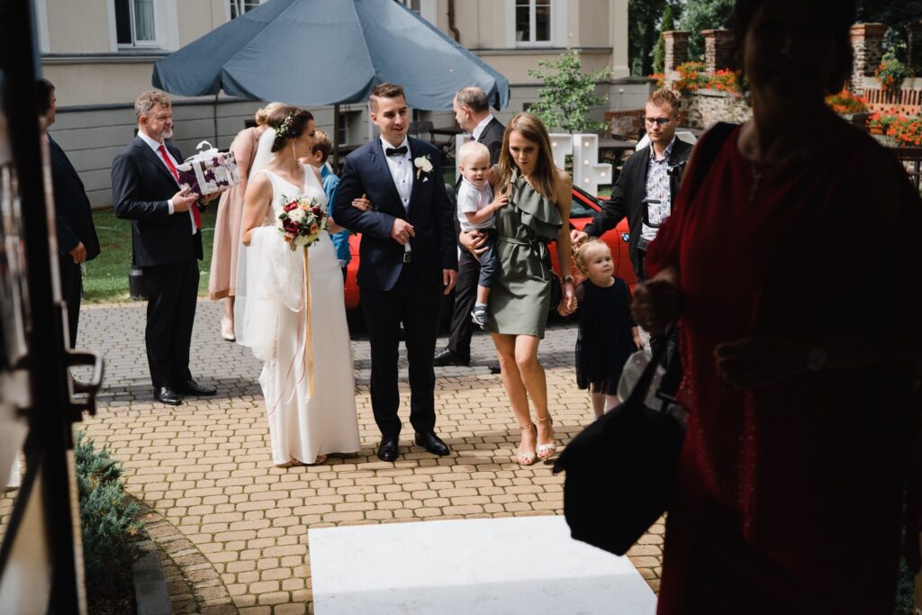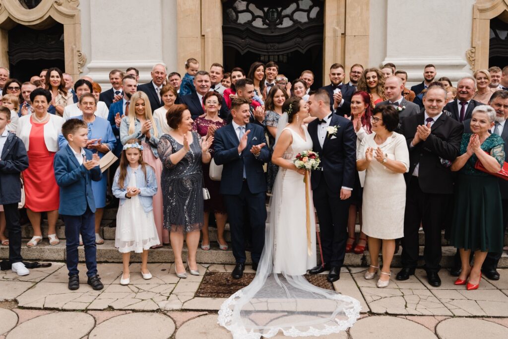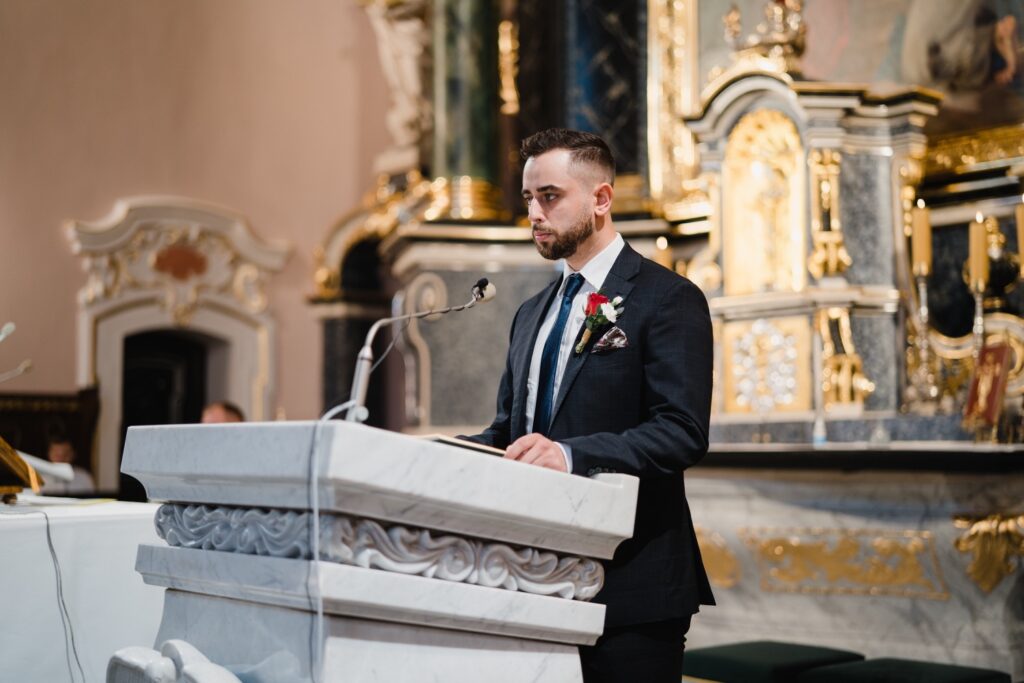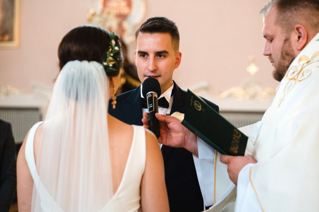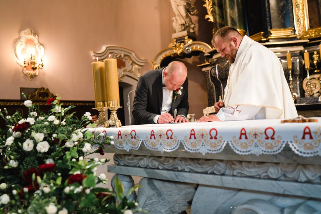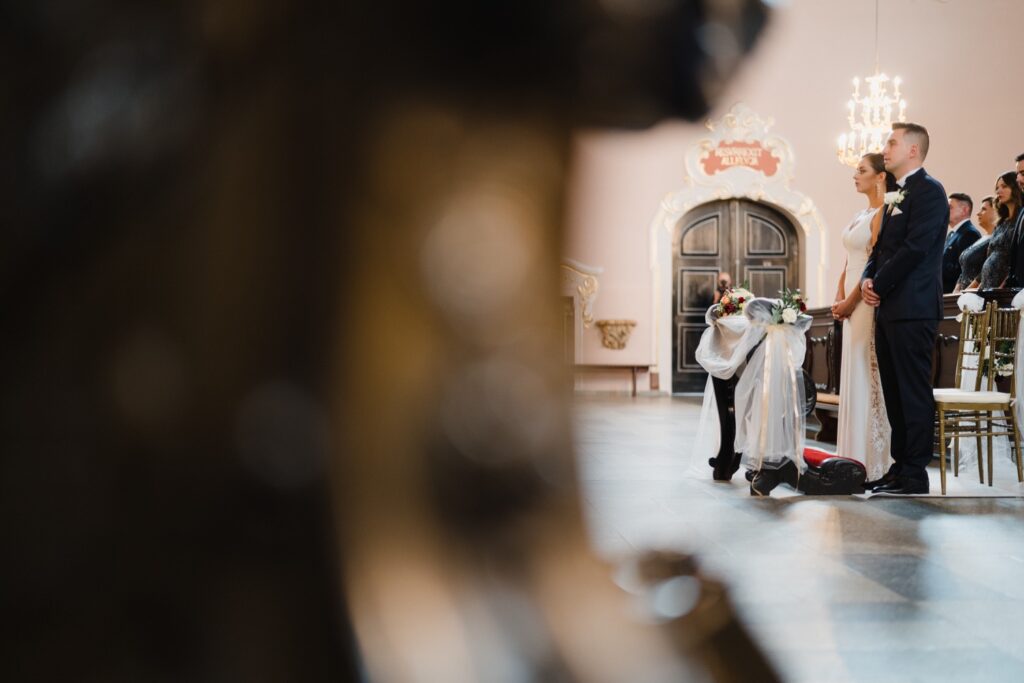Angelika i Bartek, pełni radości i optymizmu rozpoczęli swoje przygotowania. Uśmiech i aura ekscytacji wyczuwalne były w powietrzu. Jeszcze tylko ostatnie dodatki, subtelna biżuteria, zapięty mankiet oraz czuły uścisk – by móc śmiało wkroczyć w ten nowy etap życia. Błogosławieństwo rodziców dodaje otuchy, symbolizuje wsparcie i pojednanie. Swoista magia towarzyszyła zebranym gościom siedzącym w ławkach i oczekujących Państwa Młodych. Czas staje w miejscu, gdy wszystkie oczy zwrócone są na nich. Ceremonia ślubna jest jednym z kluczowych momentów tego dnia, a wypowiedziane słowa przysięgi symbolizują miłość, wierność i oddanie dwojga ludzi. Fotografując ceremonię zaślubin mam możliwość towarzyszyć Wam również emocjonalnie w tym dniu. Rozbrzmiewające pieśni chóralne, dźwięk kościelnych organów budują niezapomniany klimat. Oranżeria kościoła dodała szyku całej ceremonii oraz podkreśliła wyjątkowość tej chwili. Wraz z pierwszymi oklaskami i wiwatem gości rośnie euforia i ekscytacja całego dni. Pierwsze życzenia i czułe uściski napełniają Parę Młodą szczęściem i nadzieją. Jest to idealny moment na zebranie wszystkich gości i zrobienie zdjęcia grupowego.