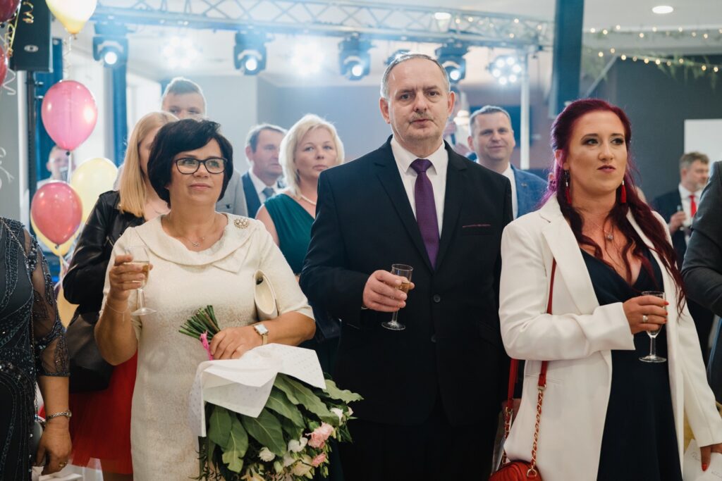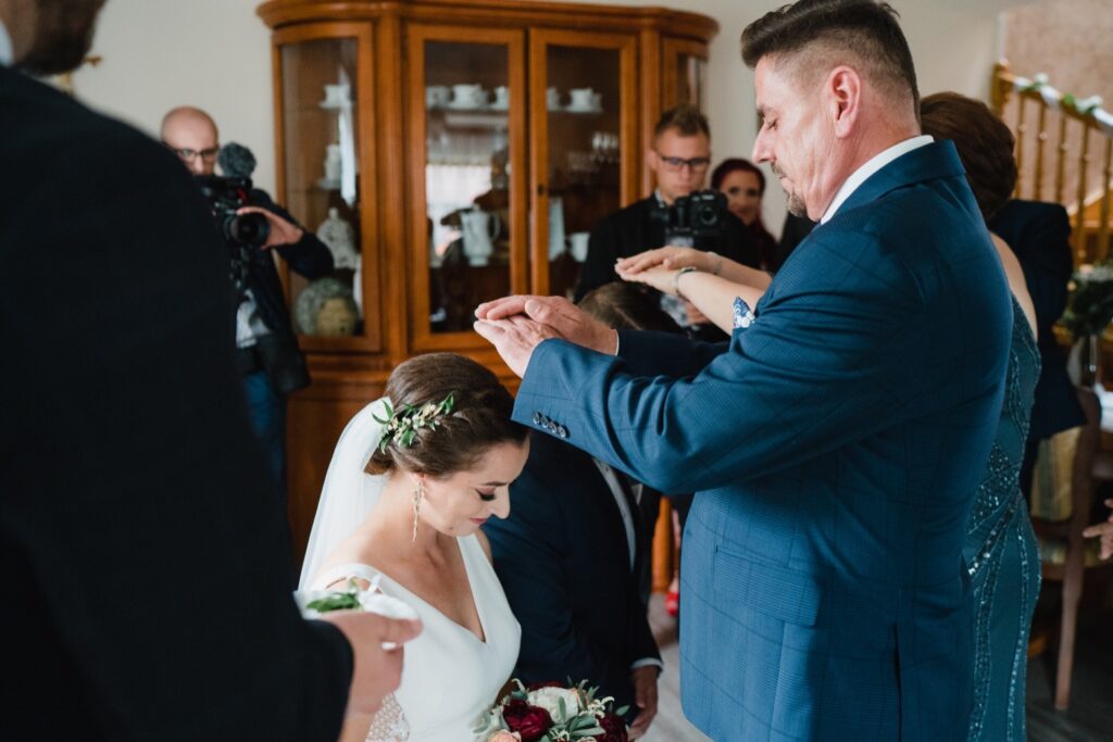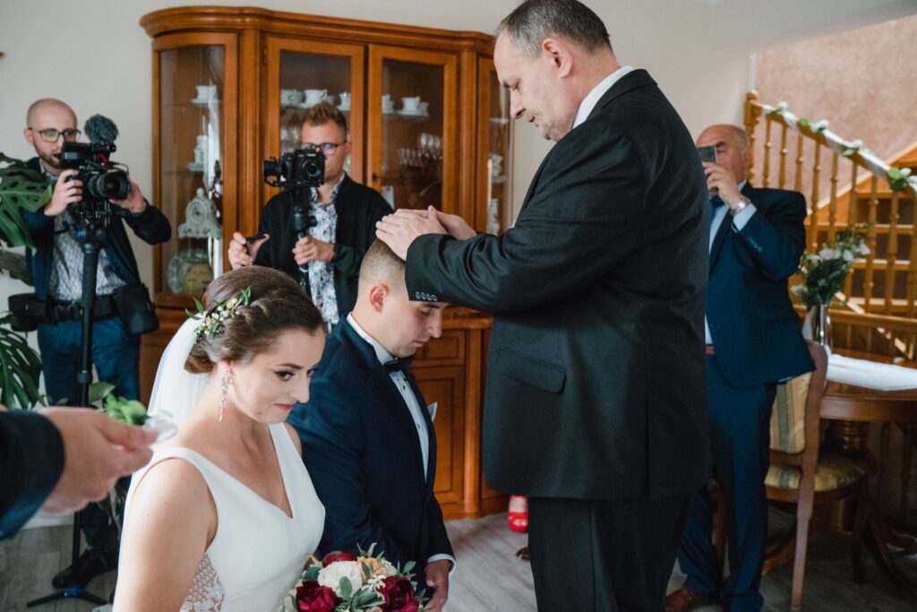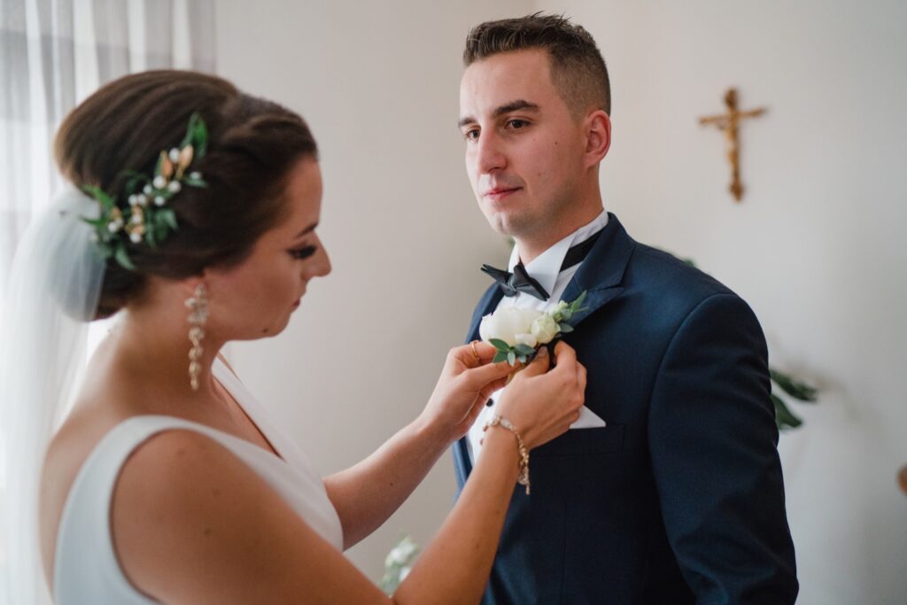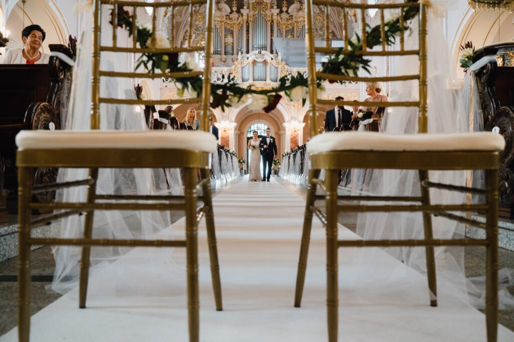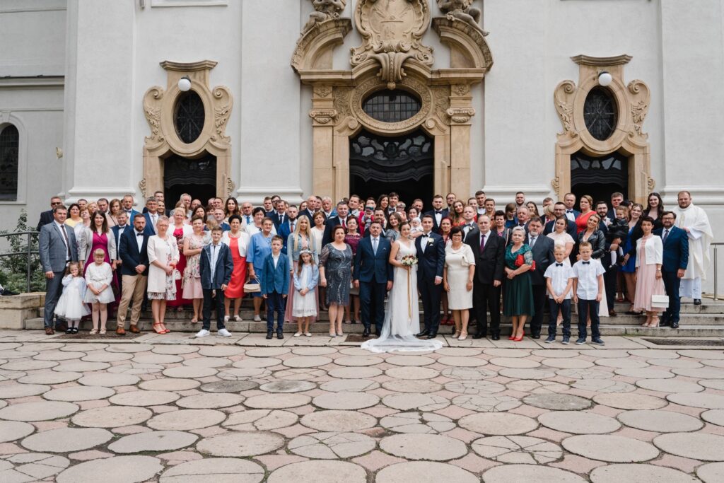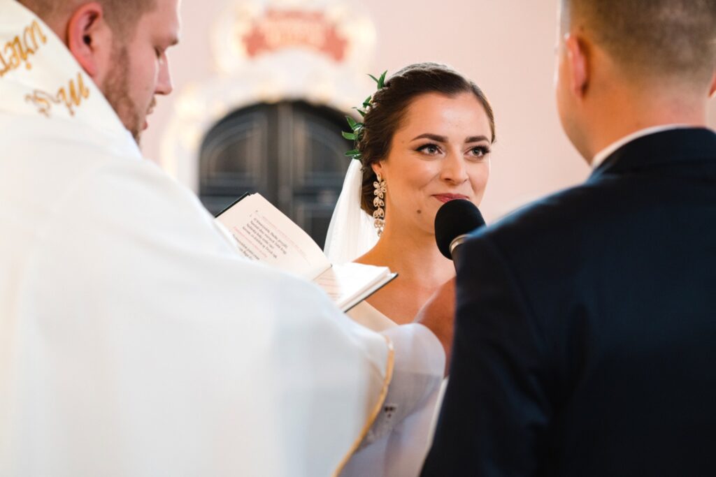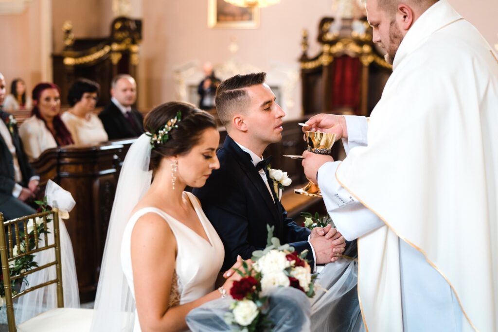Angelika i Bartek, pełni radości i optymizmu rozpoczęli swoje przygotowania. Uśmiech i aura ekscytacji wyczuwalne były w powietrzu. Jeszcze tylko ostatnie dodatki, subtelna biżuteria, zapięty mankiet oraz czuły uścisk – by móc śmiało wkroczyć w ten nowy etap życia. Błogosławieństwo rodziców dodaje otuchy, symbolizuje wsparcie i pojednanie. Swoista magia towarzyszyła zebranym gościom siedzącym w ławkach i oczekujących Państwa Młodych. Czas staje w miejscu, gdy wszystkie oczy zwrócone są na nich. Ceremonia ślubna jest jednym z kluczowych momentów tego dnia, a wypowiedziane słowa przysięgi symbolizują miłość, wierność i oddanie dwojga ludzi. Fotografując ceremonię zaślubin mam możliwość towarzyszyć Wam również emocjonalnie w tym dniu. Rozbrzmiewające pieśni chóralne, dźwięk kościelnych organów budują niezapomniany klimat. Oranżeria kościoła dodała szyku całej ceremonii oraz podkreśliła wyjątkowość tej chwili. Wraz z pierwszymi oklaskami i wiwatem gości rośnie euforia i ekscytacja całego dni. Pierwsze życzenia i czułe uściski napełniają Parę Młodą szczęściem i nadzieją. Jest to idealny moment na zebranie wszystkich gości i zrobienie zdjęcia grupowego.