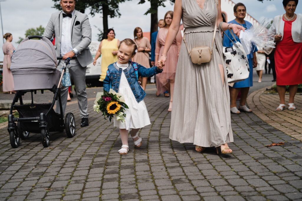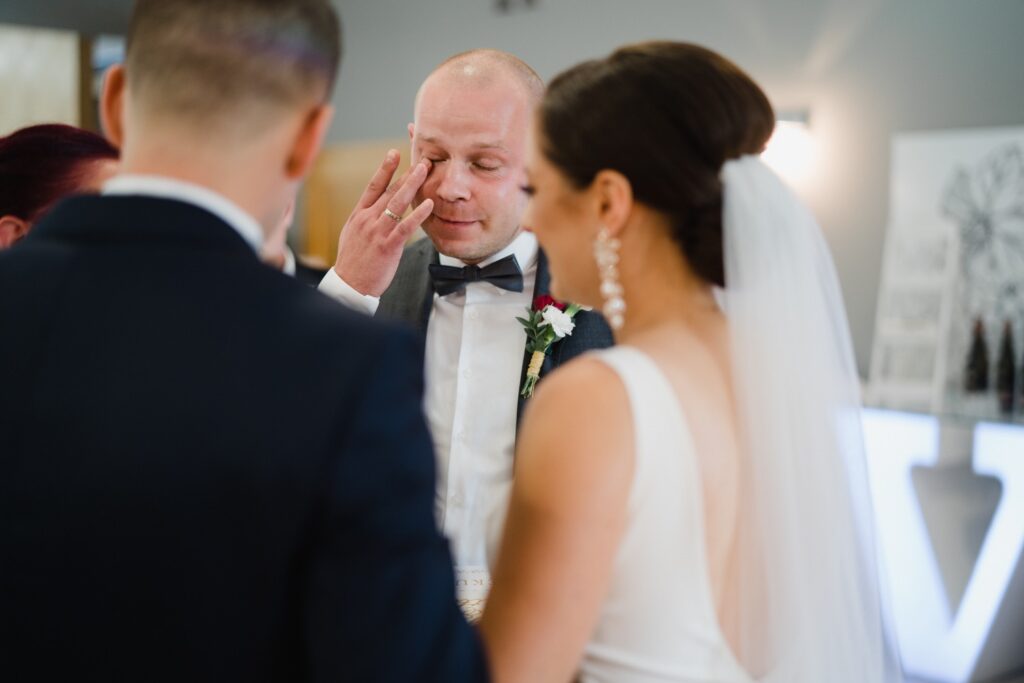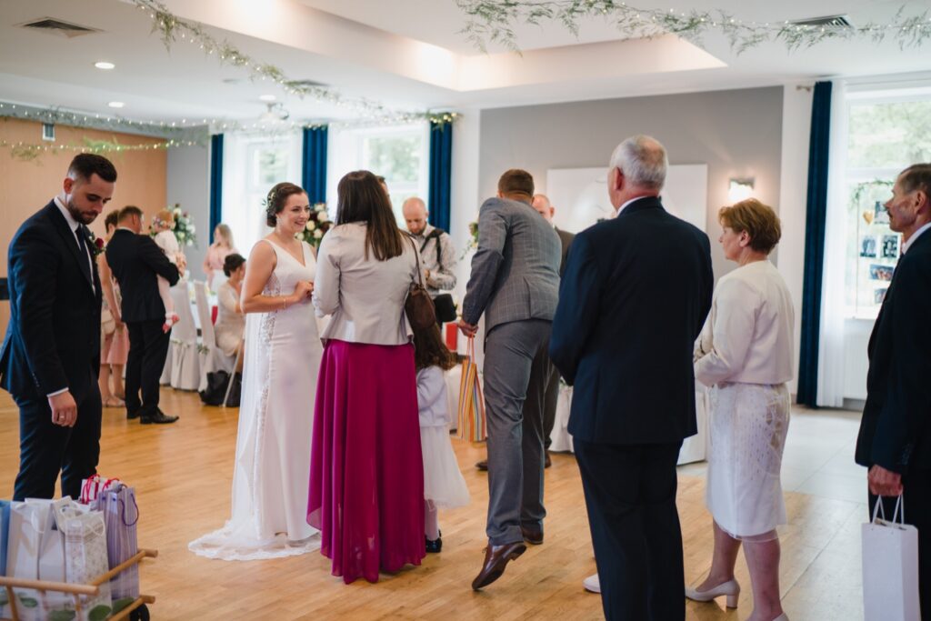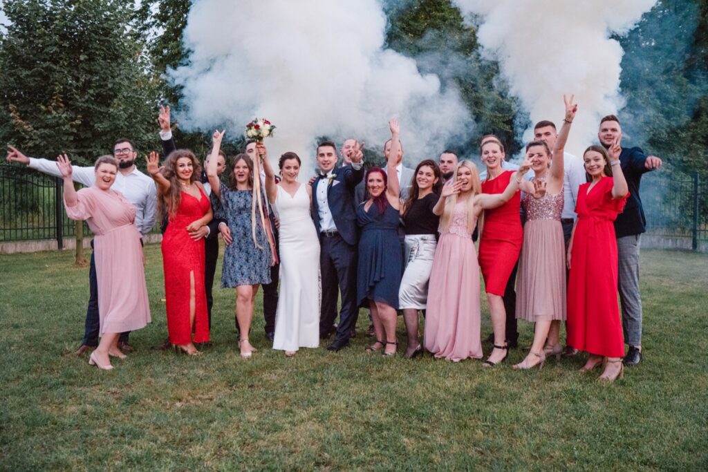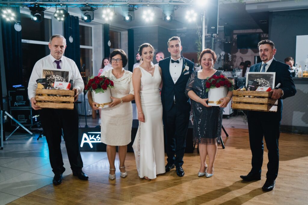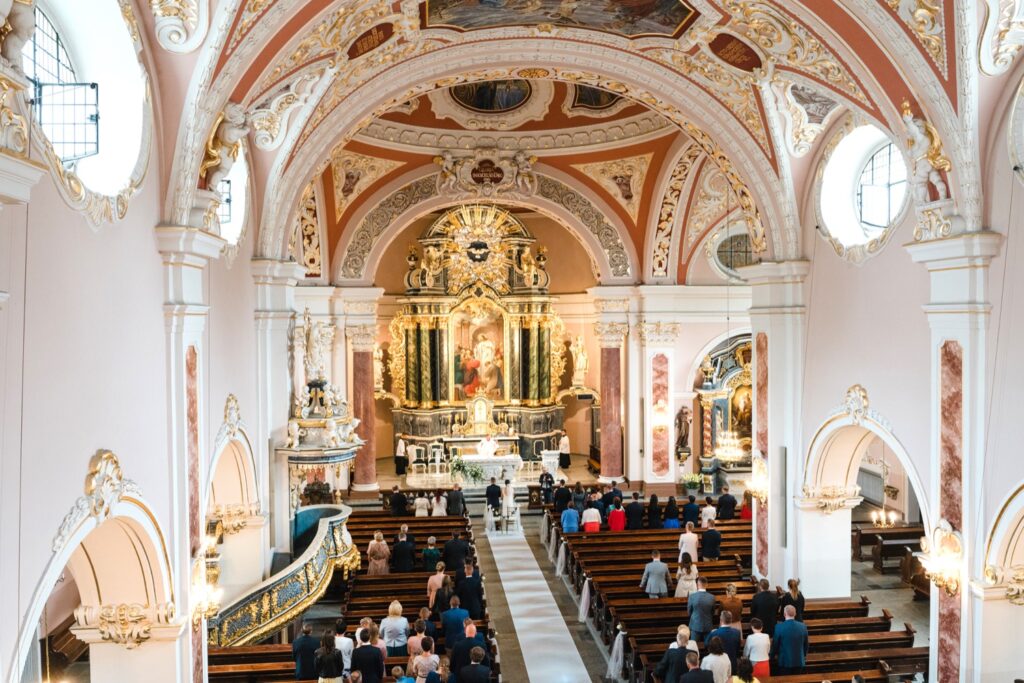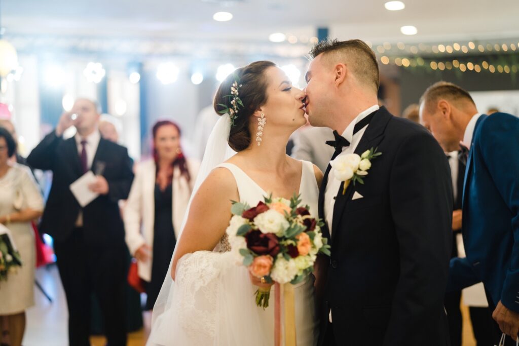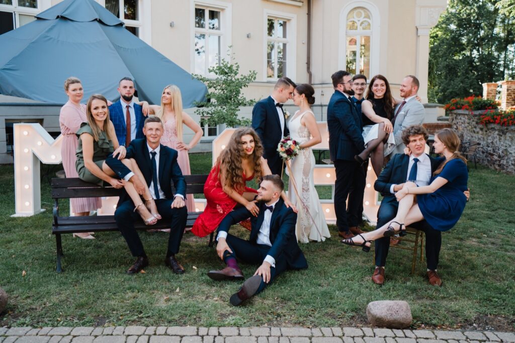 Angelika i Bartek, pełni radości i optymizmu rozpoczęli swoje przygotowania. Uśmiech i aura ekscytacji wyczuwalne były w powietrzu. Jeszcze tylko ostatnie dodatki, subtelna biżuteria, zapięty mankiet oraz czuły uścisk – by móc śmiało wkroczyć w ten nowy etap życia. Błogosławieństwo rodziców dodaje otuchy, symbolizuje wsparcie i pojednanie. Swoista magia towarzyszyła zebranym gościom siedzącym w ławkach i oczekujących Państwa Młodych. Czas staje w miejscu, gdy wszystkie oczy zwrócone są na nich. Ceremonia ślubna jest jednym z kluczowych momentów tego dnia, a wypowiedziane słowa przysięgi symbolizują miłość, wierność i oddanie dwojga ludzi. Fotografując ceremonię zaślubin mam możliwość towarzyszyć Wam również emocjonalnie w tym dniu. Rozbrzmiewające pieśni chóralne, dźwięk kościelnych organów budują niezapomniany klimat. Oranżeria kościoła dodała szyku całej ceremonii oraz podkreśliła wyjątkowość tej chwili. Wraz z pierwszymi oklaskami i wiwatem gości rośnie euforia i ekscytacja całego dni. Pierwsze życzenia i czułe uściski napełniają Parę Młodą szczęściem i nadzieją. Jest to idealny moment na zebranie wszystkich gości i zrobienie zdjęcia grupowego.