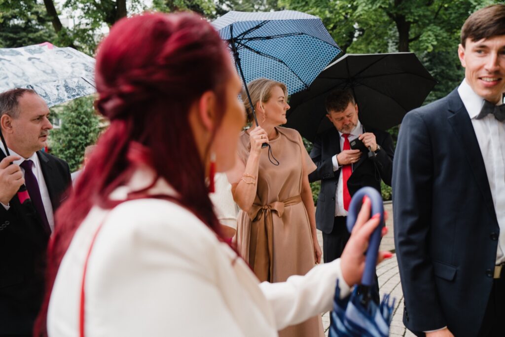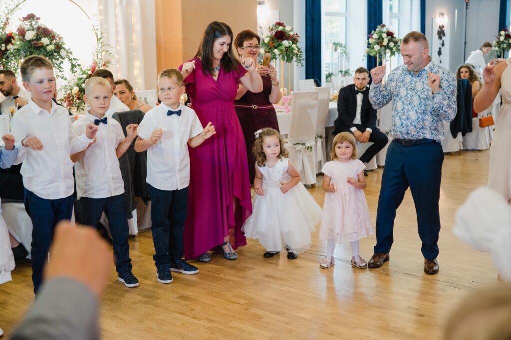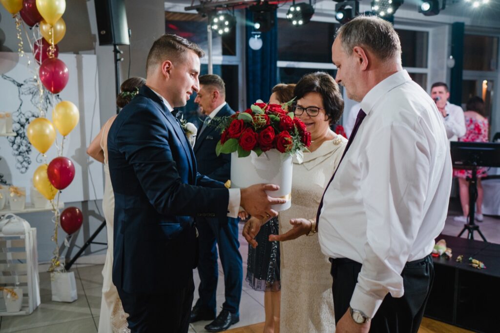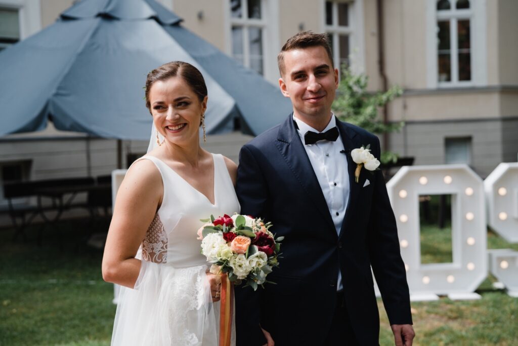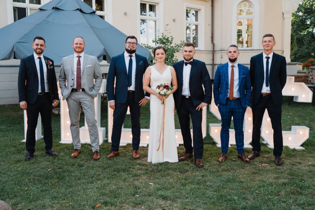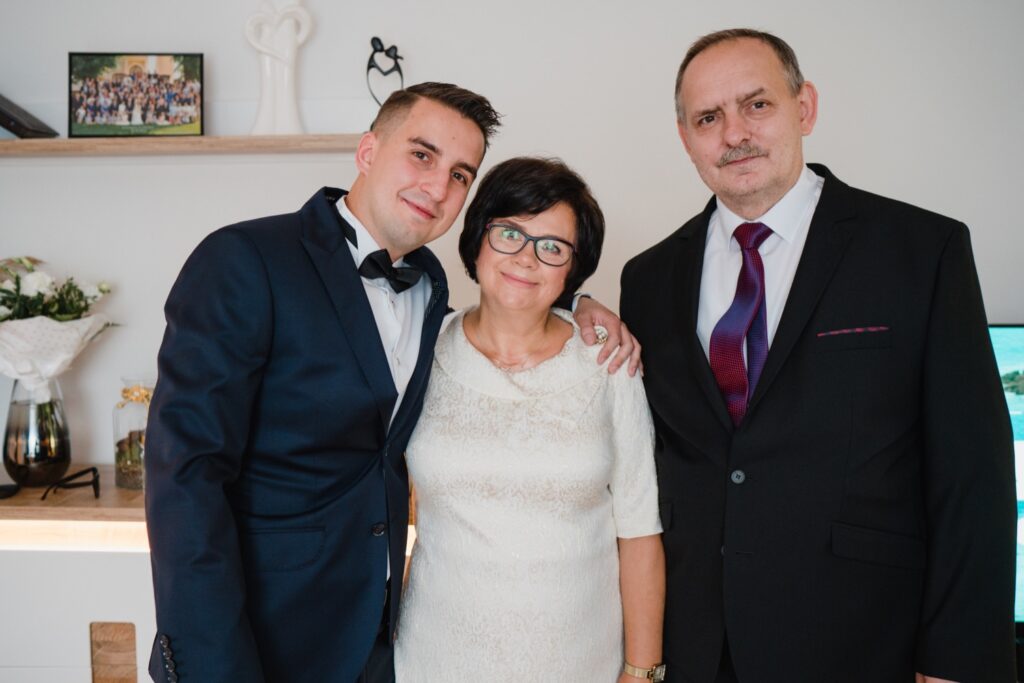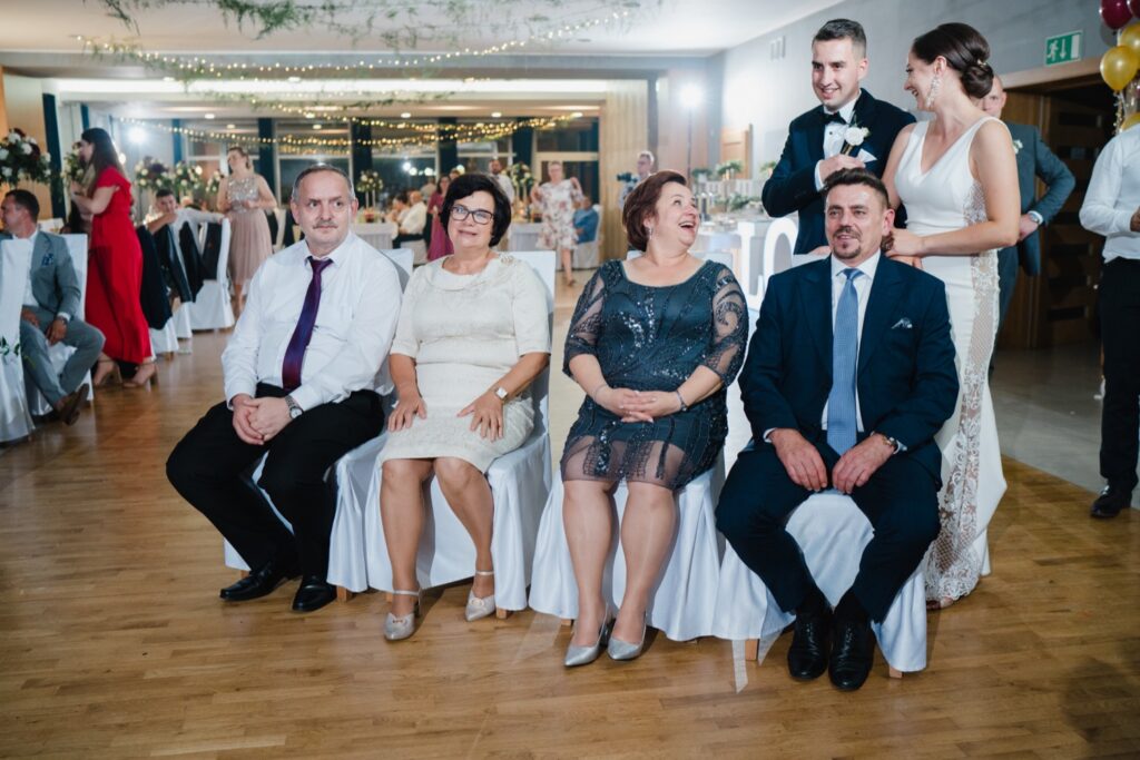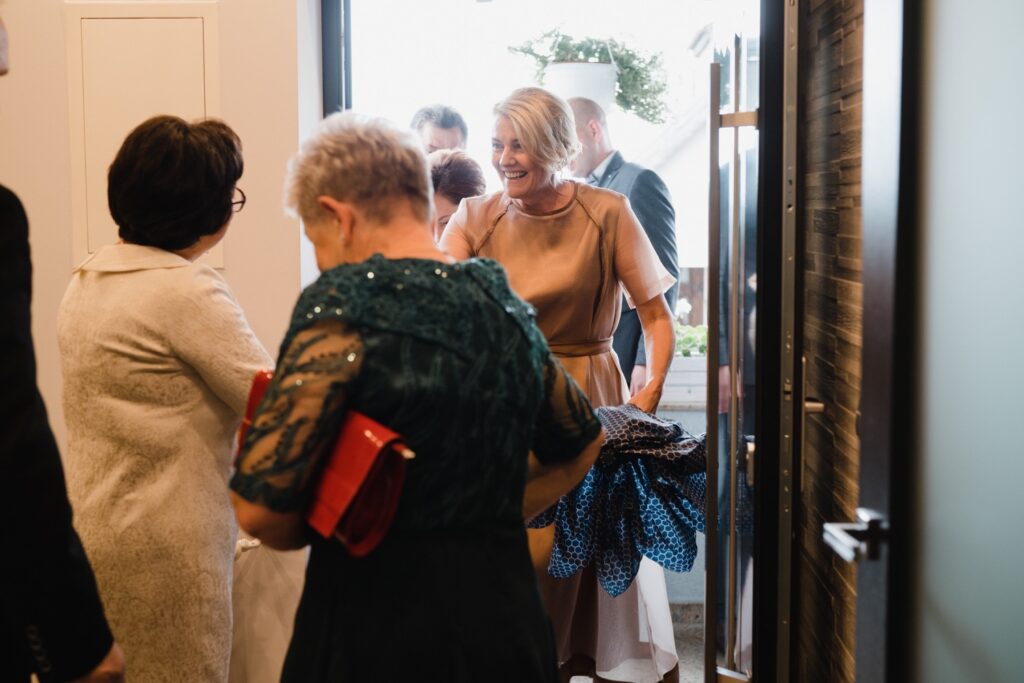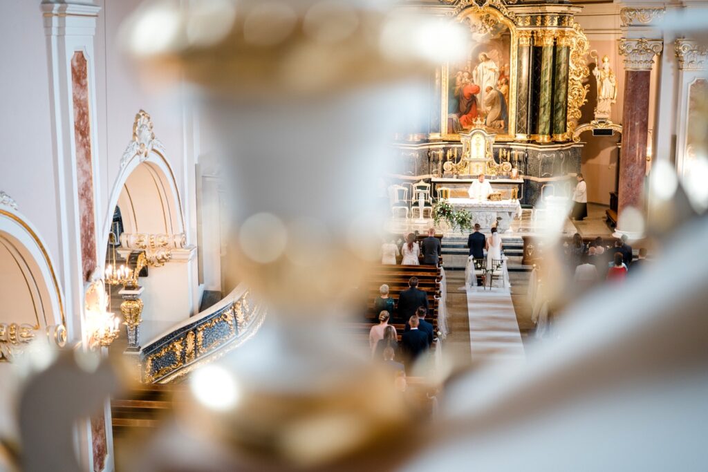 Angelika i Bartek, pełni radości i optymizmu rozpoczęli swoje przygotowania. Uśmiech i aura ekscytacji wyczuwalne były w powietrzu. Jeszcze tylko ostatnie dodatki, subtelna biżuteria, zapięty mankiet oraz czuły uścisk – by móc śmiało wkroczyć w ten nowy etap życia. Błogosławieństwo rodziców dodaje otuchy, symbolizuje wsparcie i pojednanie. Swoista magia towarzyszyła zebranym gościom siedzącym w ławkach i oczekujących Państwa Młodych. Czas staje w miejscu, gdy wszystkie oczy zwrócone są na nich. Ceremonia ślubna jest jednym z kluczowych momentów tego dnia, a wypowiedziane słowa przysięgi symbolizują miłość, wierność i oddanie dwojga ludzi. Fotografując ceremonię zaślubin mam możliwość towarzyszyć Wam również emocjonalnie w tym dniu. Rozbrzmiewające pieśni chóralne, dźwięk kościelnych organów budują niezapomniany klimat. Oranżeria kościoła dodała szyku całej ceremonii oraz podkreśliła wyjątkowość tej chwili. Wraz z pierwszymi oklaskami i wiwatem gości rośnie euforia i ekscytacja całego dni. Pierwsze życzenia i czułe uściski napełniają Parę Młodą szczęściem i nadzieją. Jest to idealny moment na zebranie wszystkich gości i zrobienie zdjęcia grupowego.