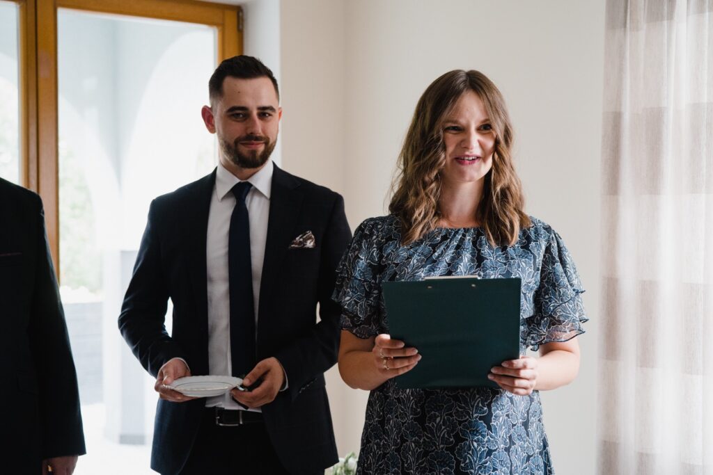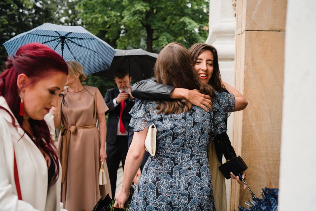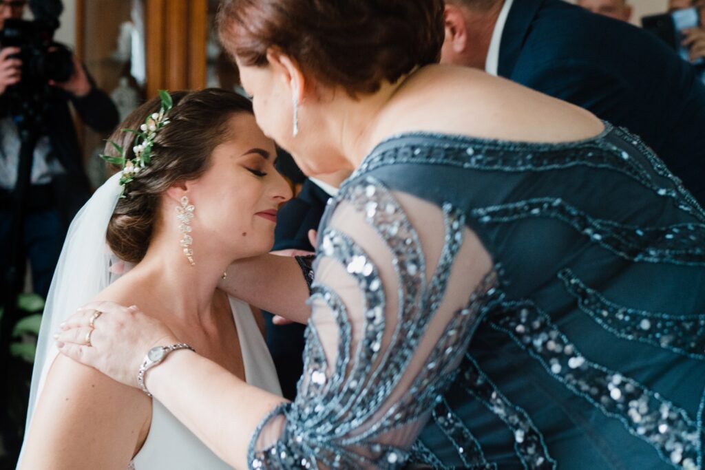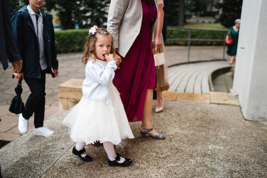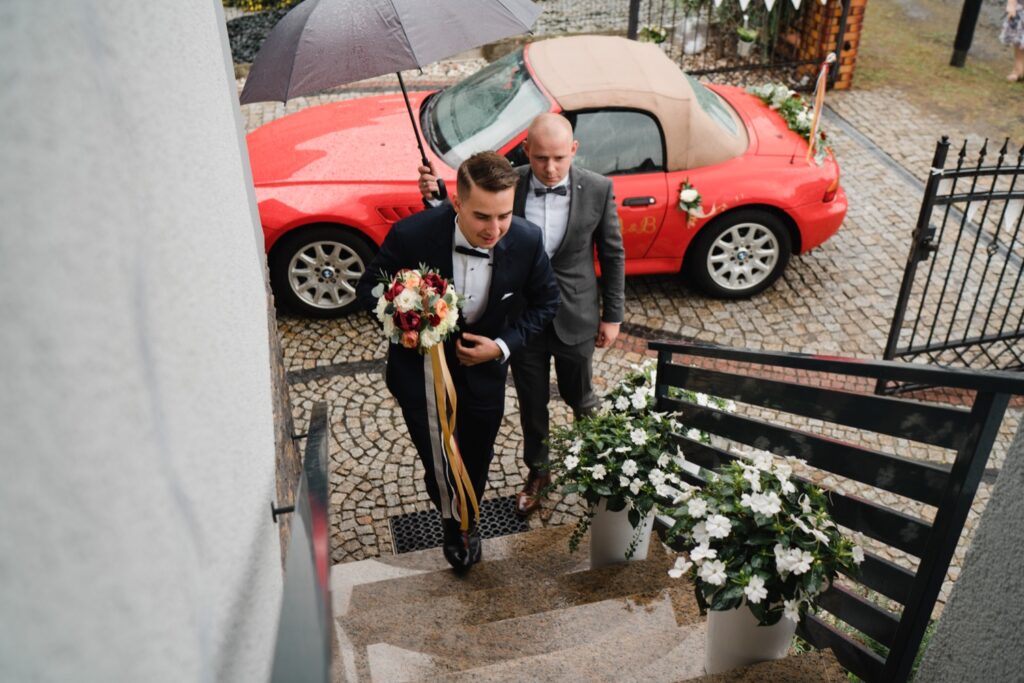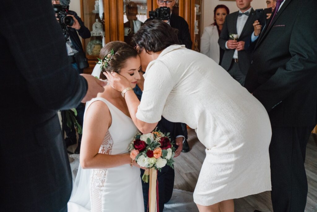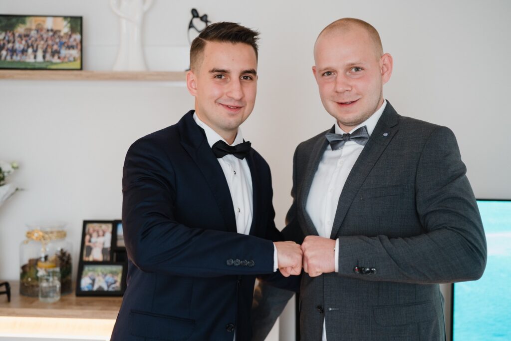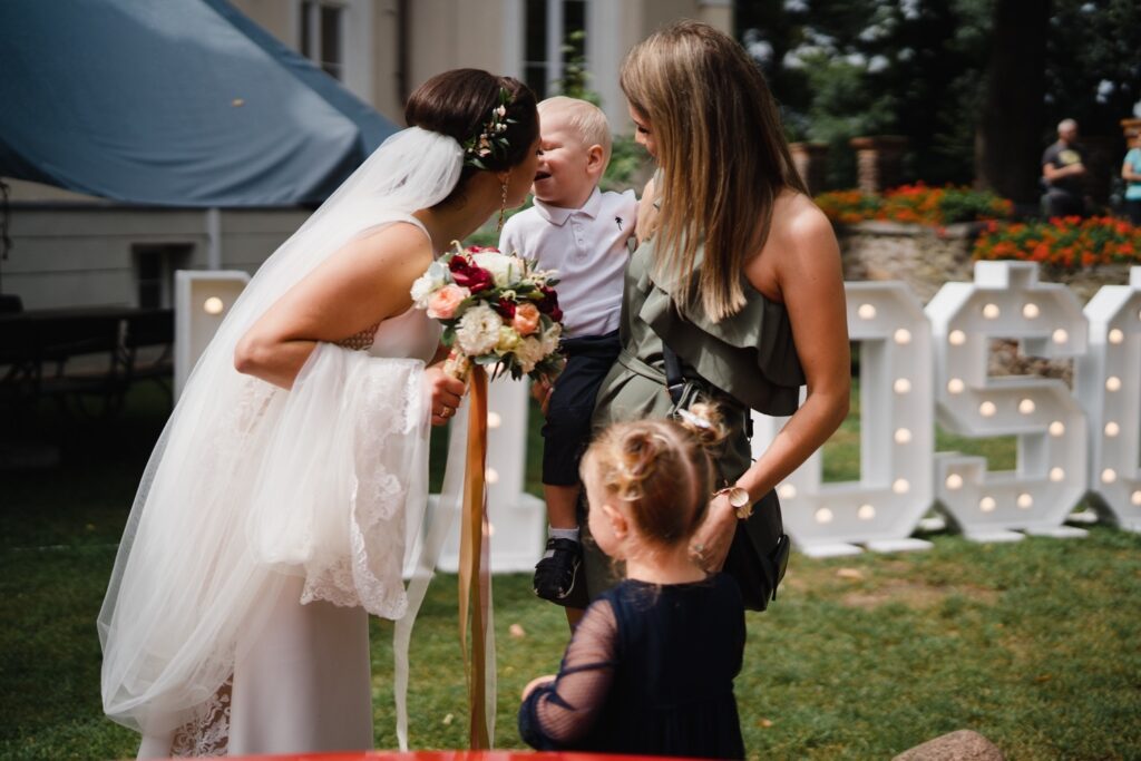 Angelika i Bartek, pełni radości i optymizmu rozpoczęli swoje przygotowania. Uśmiech i aura ekscytacji wyczuwalne były w powietrzu. Jeszcze tylko ostatnie dodatki, subtelna biżuteria, zapięty mankiet oraz czuły uścisk – by móc śmiało wkroczyć w ten nowy etap życia. Błogosławieństwo rodziców dodaje otuchy, symbolizuje wsparcie i pojednanie. Swoista magia towarzyszyła zebranym gościom siedzącym w ławkach i oczekujących Państwa Młodych. Czas staje w miejscu, gdy wszystkie oczy zwrócone są na nich. Ceremonia ślubna jest jednym z kluczowych momentów tego dnia, a wypowiedziane słowa przysięgi symbolizują miłość, wierność i oddanie dwojga ludzi. Fotografując ceremonię zaślubin mam możliwość towarzyszyć Wam również emocjonalnie w tym dniu. Rozbrzmiewające pieśni chóralne, dźwięk kościelnych organów budują niezapomniany klimat. Oranżeria kościoła dodała szyku całej ceremonii oraz podkreśliła wyjątkowość tej chwili. Wraz z pierwszymi oklaskami i wiwatem gości rośnie euforia i ekscytacja całego dni. Pierwsze życzenia i czułe uściski napełniają Parę Młodą szczęściem i nadzieją. Jest to idealny moment na zebranie wszystkich gości i zrobienie zdjęcia grupowego.