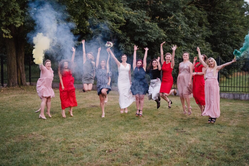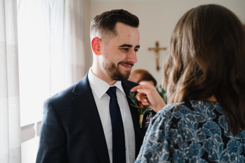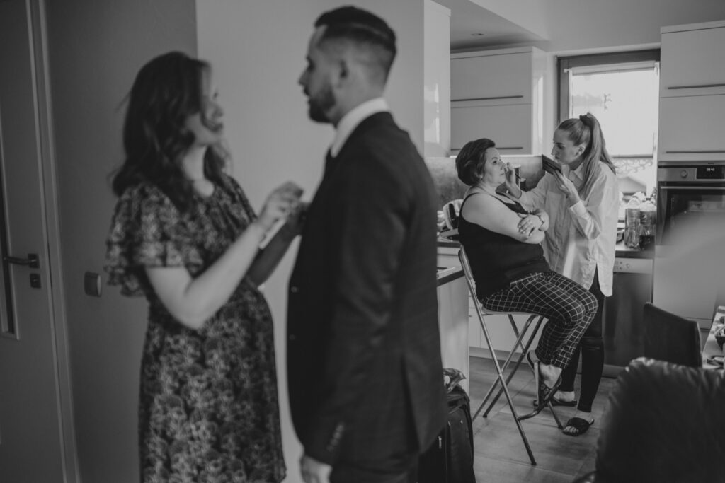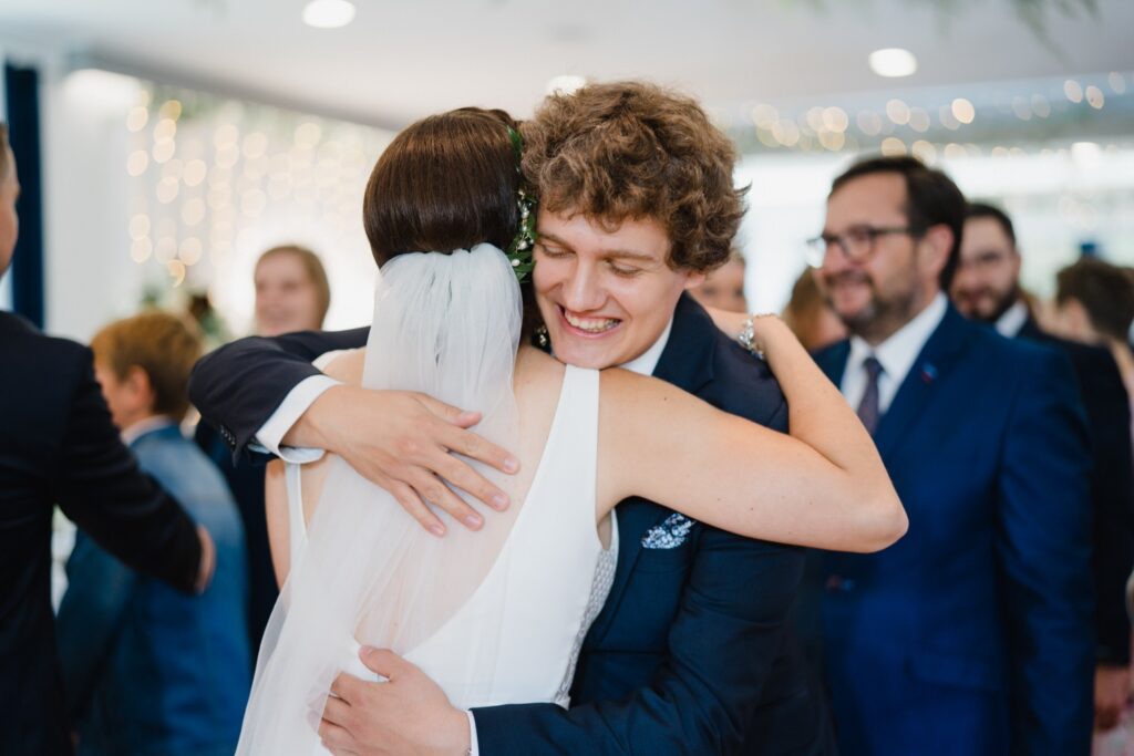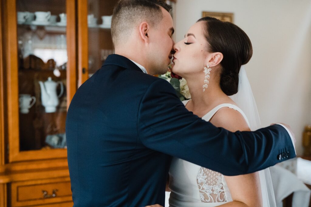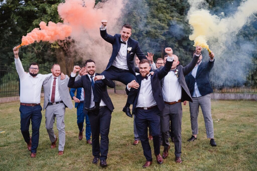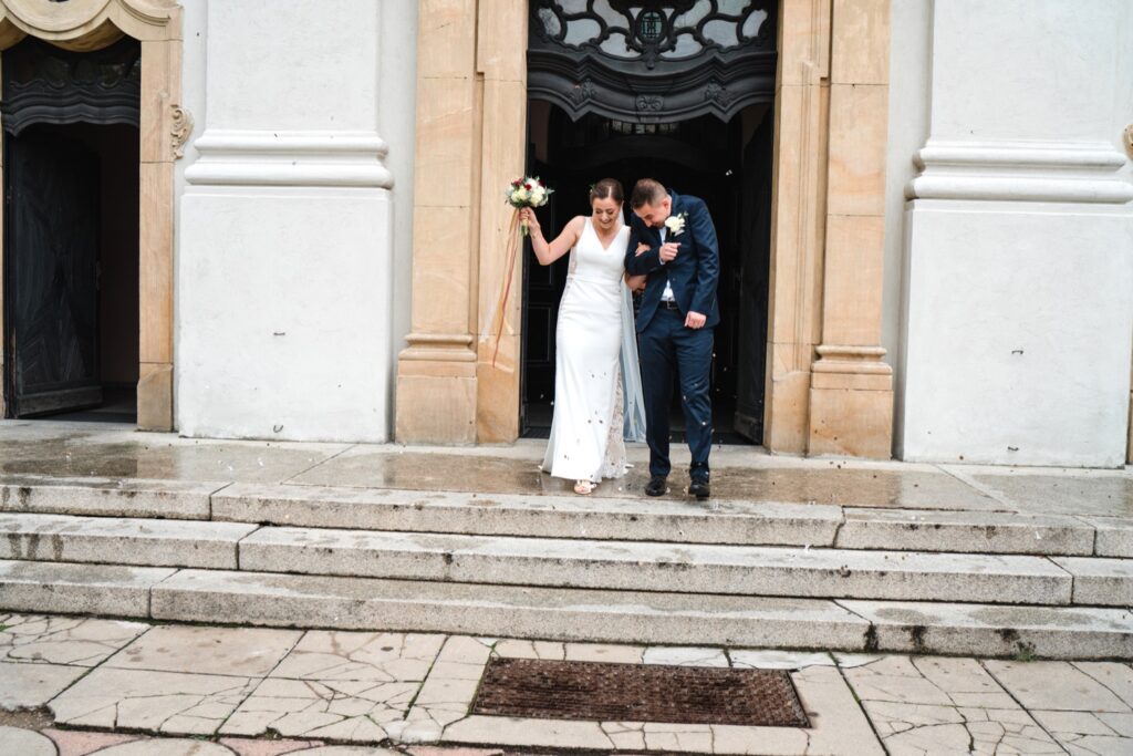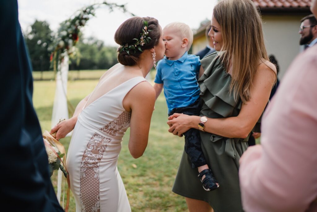 Angelika i Bartek, pełni radości i optymizmu rozpoczęli swoje przygotowania. Uśmiech i aura ekscytacji wyczuwalne były w powietrzu. Jeszcze tylko ostatnie dodatki, subtelna biżuteria, zapięty mankiet oraz czuły uścisk – by móc śmiało wkroczyć w ten nowy etap życia. Błogosławieństwo rodziców dodaje otuchy, symbolizuje wsparcie i pojednanie. Swoista magia towarzyszyła zebranym gościom siedzącym w ławkach i oczekujących Państwa Młodych. Czas staje w miejscu, gdy wszystkie oczy zwrócone są na nich. Ceremonia ślubna jest jednym z kluczowych momentów tego dnia, a wypowiedziane słowa przysięgi symbolizują miłość, wierność i oddanie dwojga ludzi. Fotografując ceremonię zaślubin mam możliwość towarzyszyć Wam również emocjonalnie w tym dniu. Rozbrzmiewające pieśni chóralne, dźwięk kościelnych organów budują niezapomniany klimat. Oranżeria kościoła dodała szyku całej ceremonii oraz podkreśliła wyjątkowość tej chwili. Wraz z pierwszymi oklaskami i wiwatem gości rośnie euforia i ekscytacja całego dni. Pierwsze życzenia i czułe uściski napełniają Parę Młodą szczęściem i nadzieją. Jest to idealny moment na zebranie wszystkich gości i zrobienie zdjęcia grupowego.