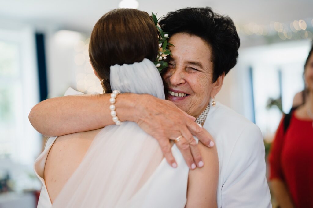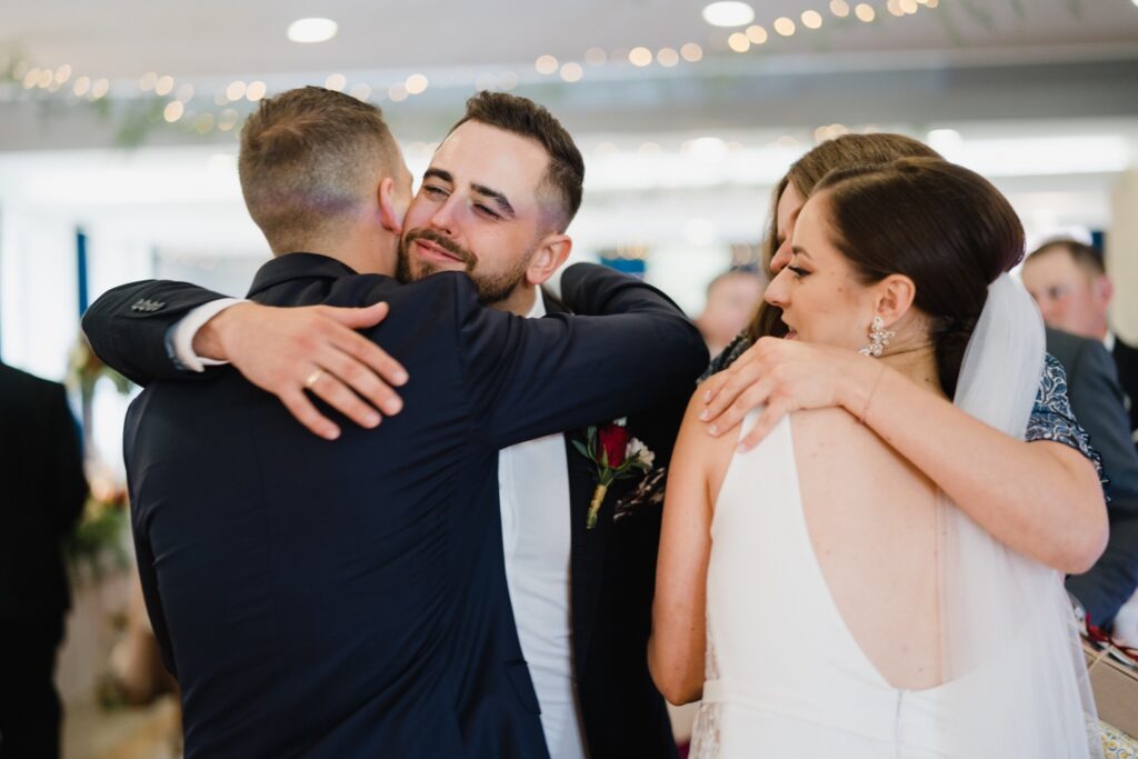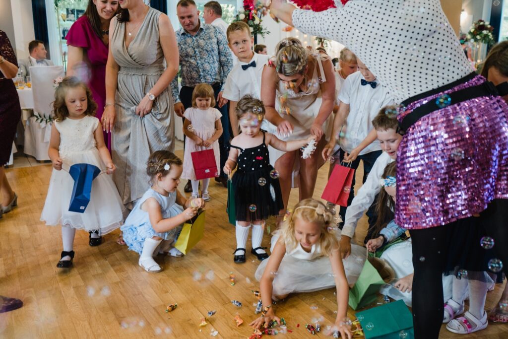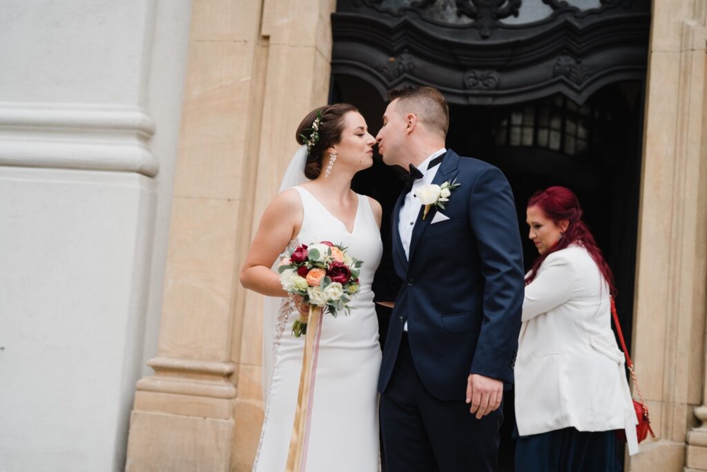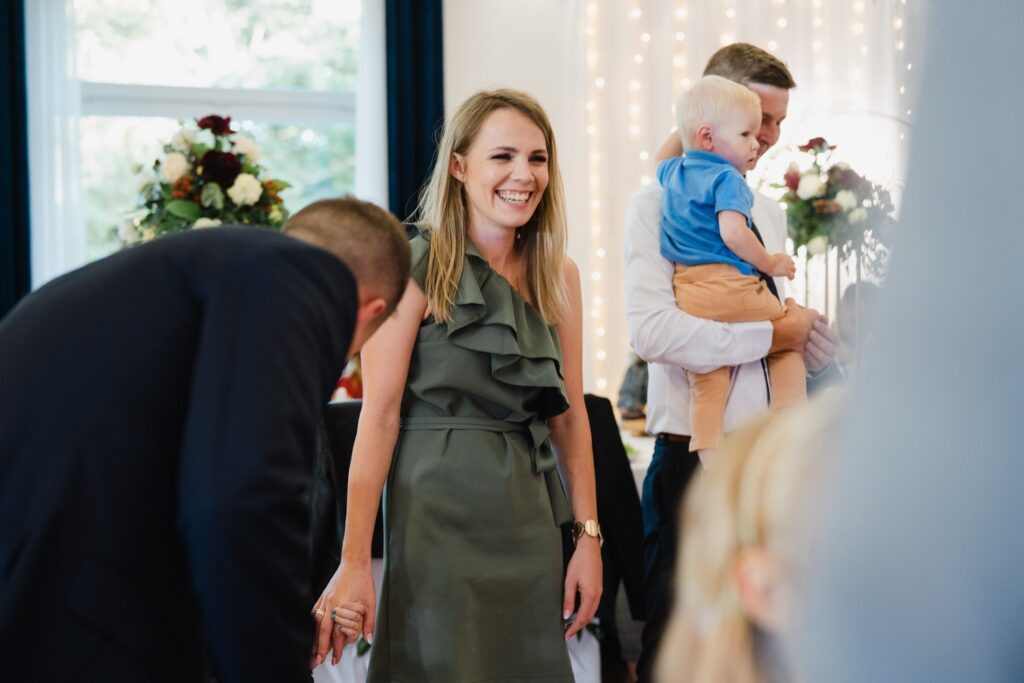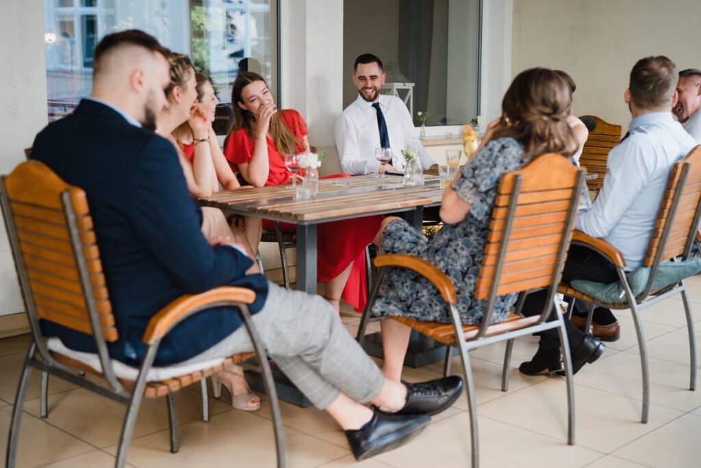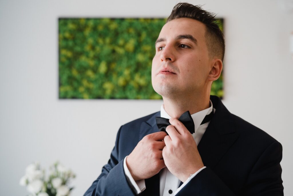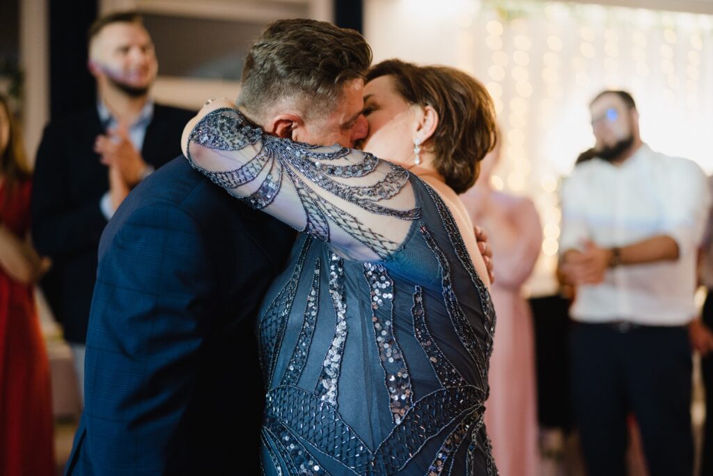 Angelika i Bartek, pełni radości i optymizmu rozpoczęli swoje przygotowania. Uśmiech i aura ekscytacji wyczuwalne były w powietrzu. Jeszcze tylko ostatnie dodatki, subtelna biżuteria, zapięty mankiet oraz czuły uścisk – by móc śmiało wkroczyć w ten nowy etap życia. Błogosławieństwo rodziców dodaje otuchy, symbolizuje wsparcie i pojednanie. Swoista magia towarzyszyła zebranym gościom siedzącym w ławkach i oczekujących Państwa Młodych. Czas staje w miejscu, gdy wszystkie oczy zwrócone są na nich. Ceremonia ślubna jest jednym z kluczowych momentów tego dnia, a wypowiedziane słowa przysięgi symbolizują miłość, wierność i oddanie dwojga ludzi. Fotografując ceremonię zaślubin mam możliwość towarzyszyć Wam również emocjonalnie w tym dniu. Rozbrzmiewające pieśni chóralne, dźwięk kościelnych organów budują niezapomniany klimat. Oranżeria kościoła dodała szyku całej ceremonii oraz podkreśliła wyjątkowość tej chwili. Wraz z pierwszymi oklaskami i wiwatem gości rośnie euforia i ekscytacja całego dni. Pierwsze życzenia i czułe uściski napełniają Parę Młodą szczęściem i nadzieją. Jest to idealny moment na zebranie wszystkich gości i zrobienie zdjęcia grupowego.