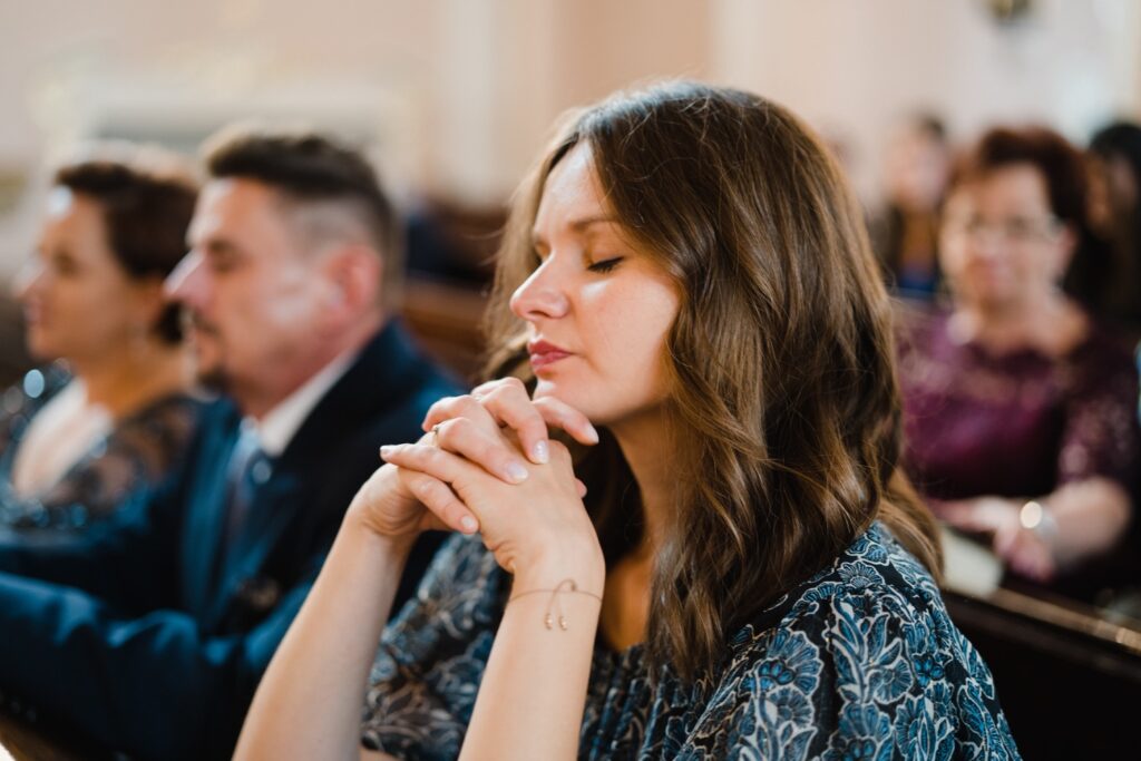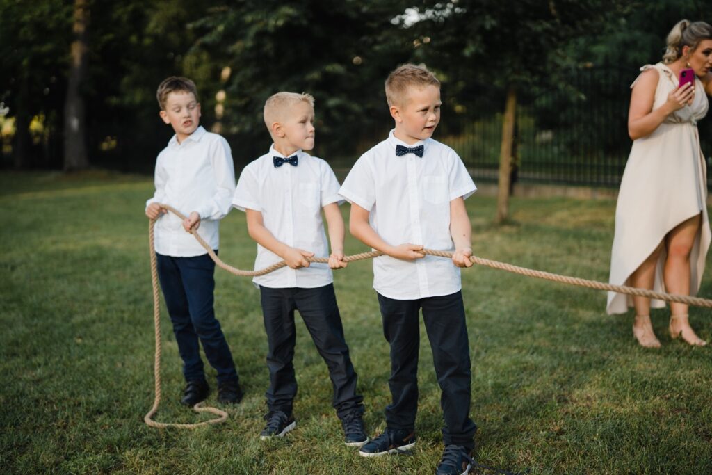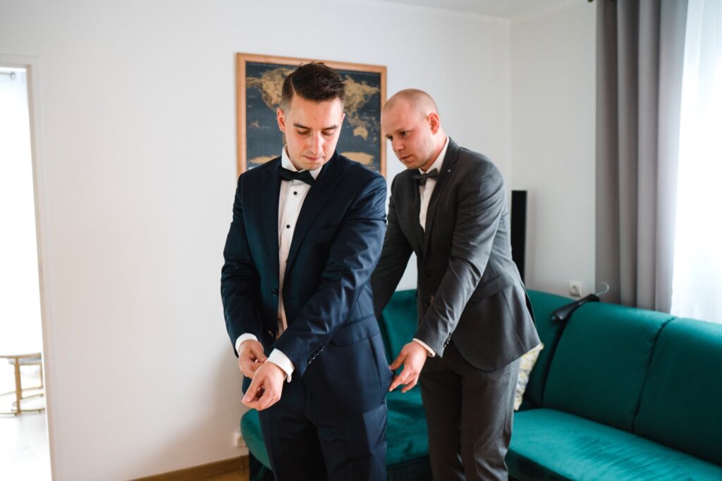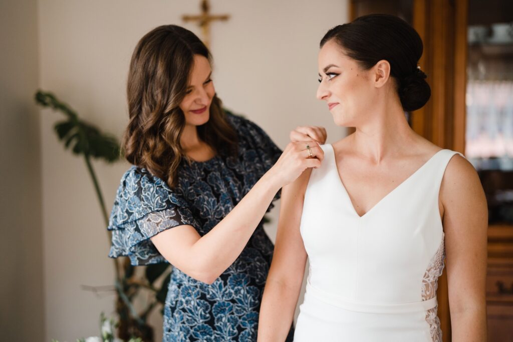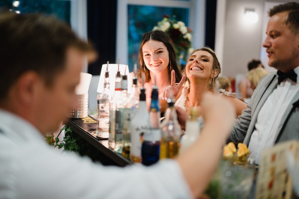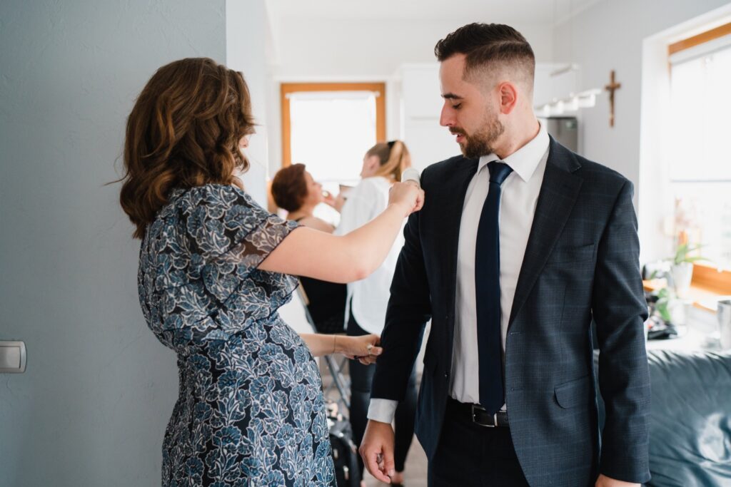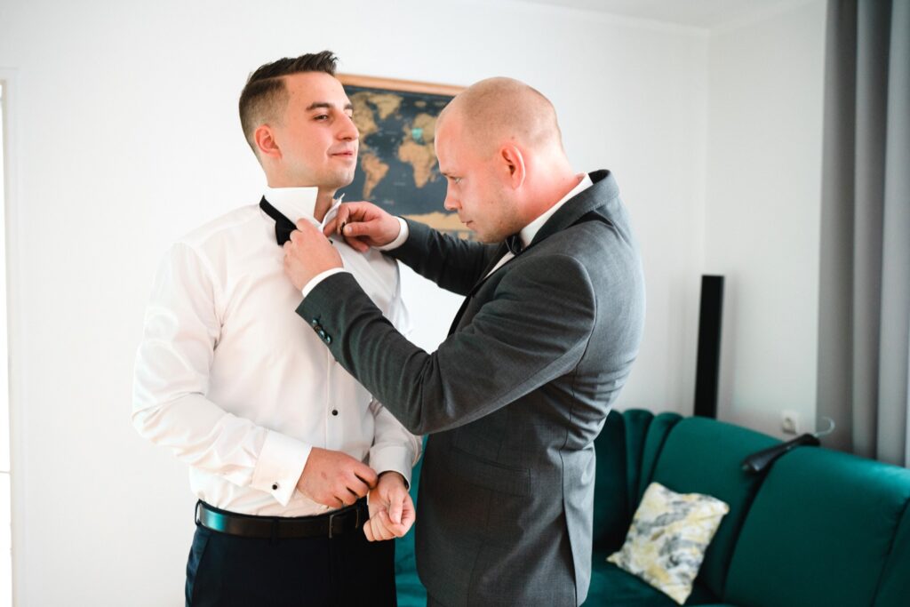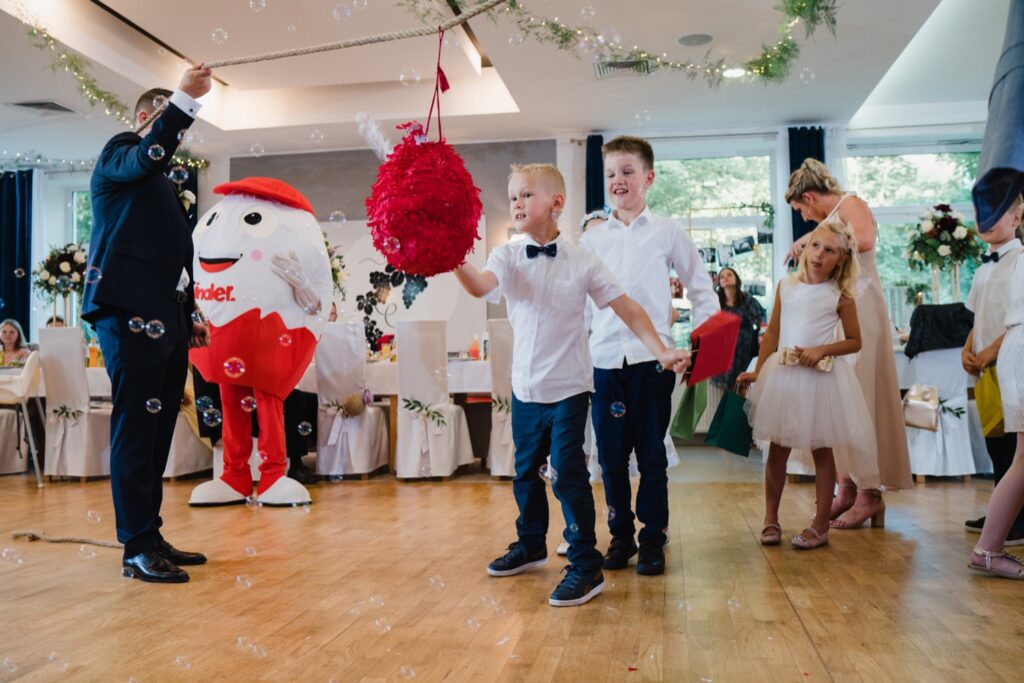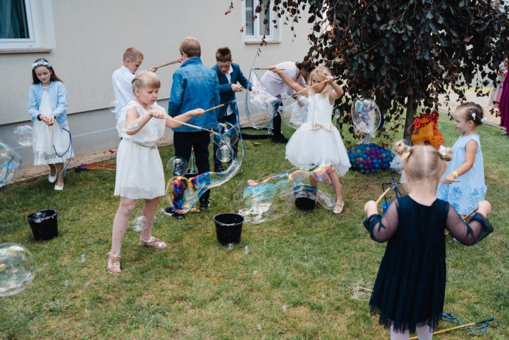 Angelika i Bartek, pełni radości i optymizmu rozpoczęli swoje przygotowania. Uśmiech i aura ekscytacji wyczuwalne były w powietrzu. Jeszcze tylko ostatnie dodatki, subtelna biżuteria, zapięty mankiet oraz czuły uścisk – by móc śmiało wkroczyć w ten nowy etap życia. Błogosławieństwo rodziców dodaje otuchy, symbolizuje wsparcie i pojednanie. Swoista magia towarzyszyła zebranym gościom siedzącym w ławkach i oczekujących Państwa Młodych. Czas staje w miejscu, gdy wszystkie oczy zwrócone są na nich. Ceremonia ślubna jest jednym z kluczowych momentów tego dnia, a wypowiedziane słowa przysięgi symbolizują miłość, wierność i oddanie dwojga ludzi. Fotografując ceremonię zaślubin mam możliwość towarzyszyć Wam również emocjonalnie w tym dniu. Rozbrzmiewające pieśni chóralne, dźwięk kościelnych organów budują niezapomniany klimat. Oranżeria kościoła dodała szyku całej ceremonii oraz podkreśliła wyjątkowość tej chwili. Wraz z pierwszymi oklaskami i wiwatem gości rośnie euforia i ekscytacja całego dni. Pierwsze życzenia i czułe uściski napełniają Parę Młodą szczęściem i nadzieją. Jest to idealny moment na zebranie wszystkich gości i zrobienie zdjęcia grupowego.